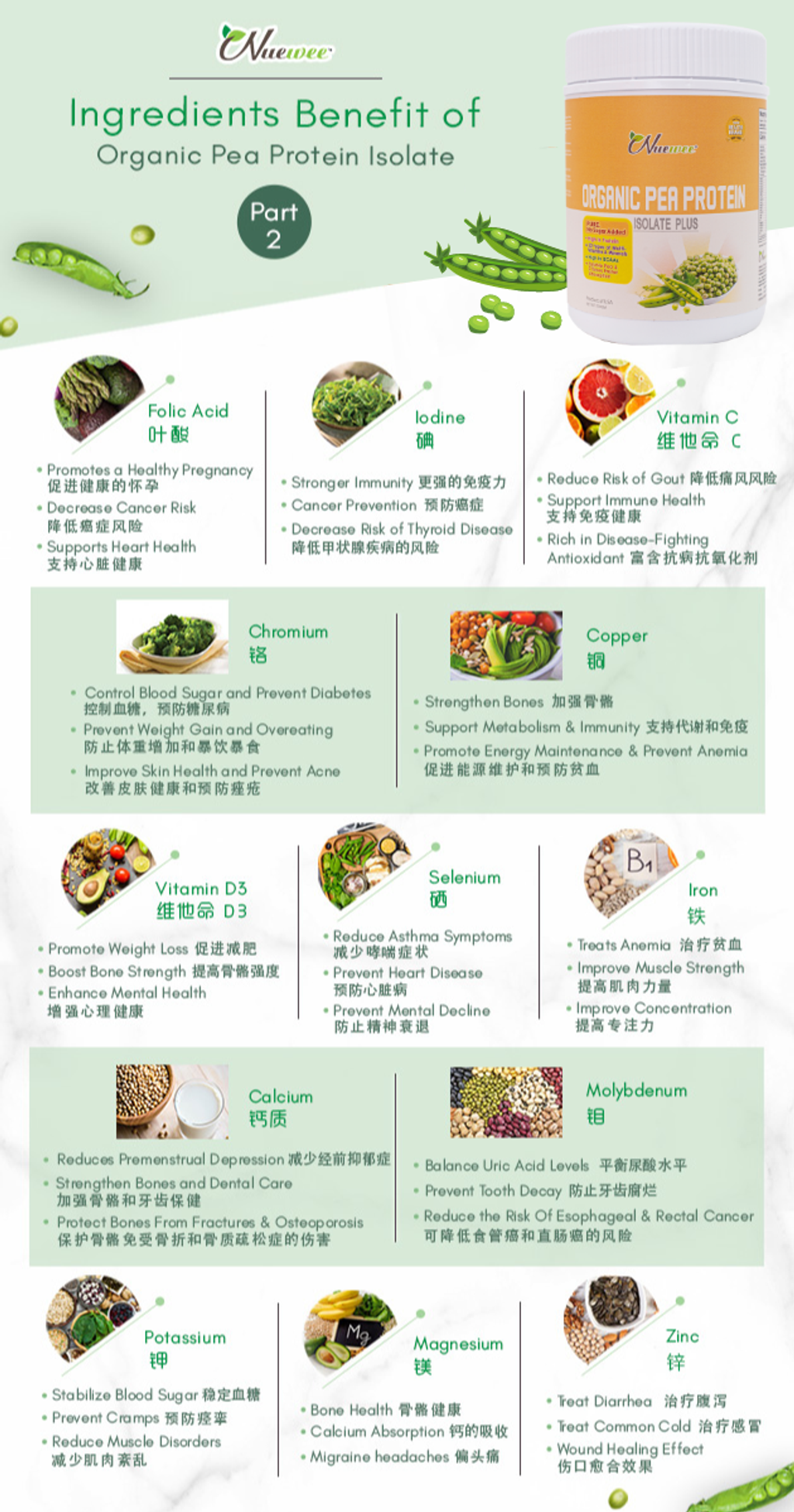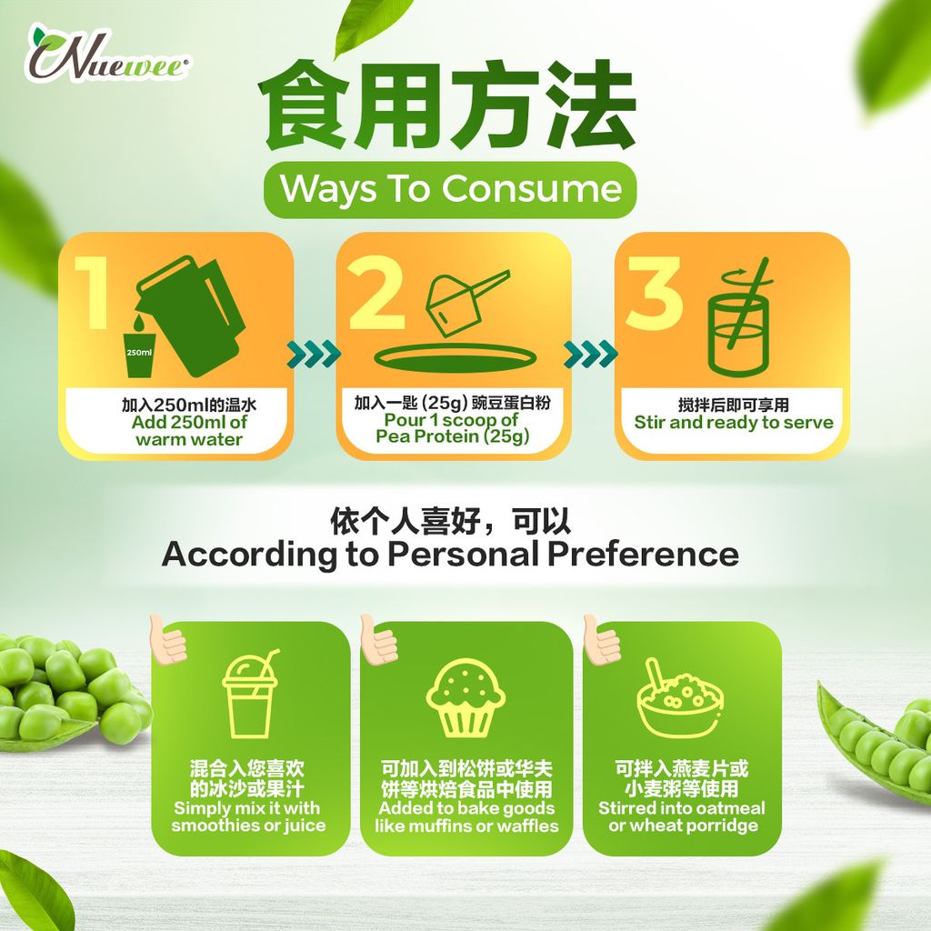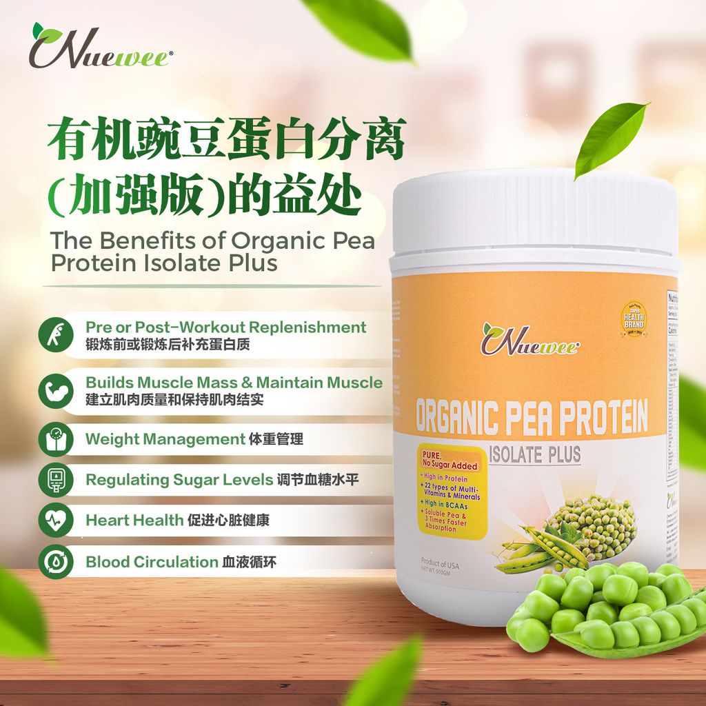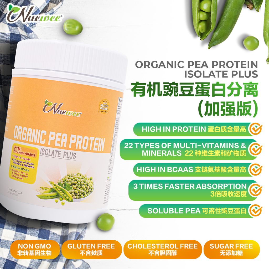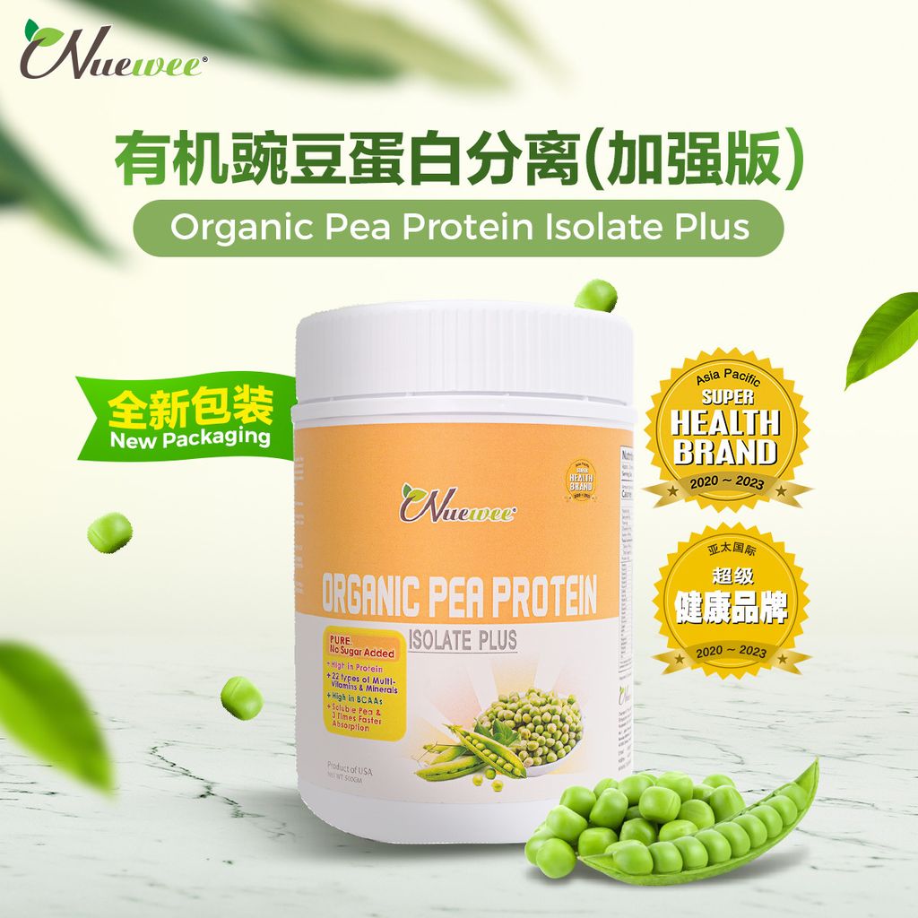 Nuewee有机豌豆蛋白分离Plus富含高蛋白质,高钙及22种综合维他命与矿物质。它也是极度容易消化和被吸收,完全可以替代动物蛋白。