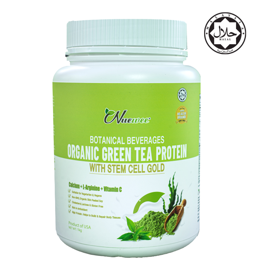 Nuewee Organic Green Tea Protein with Stem Cell Gold(daripada ekstrak Algae Rumpai Laut) merupakan sejenis minuman kesihatan berkhasiat yang bergabung dengan soya, iaitu satu sumber protein dan kalsium yang baik. Manakala, teh hijau adalah anti-oksidan yang kuat.
